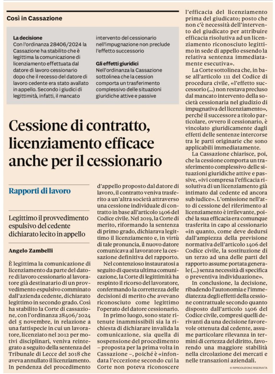 Pubblicato il nuovo articolo di angelo Zambelli su Il Sole 24 Ore di oggi