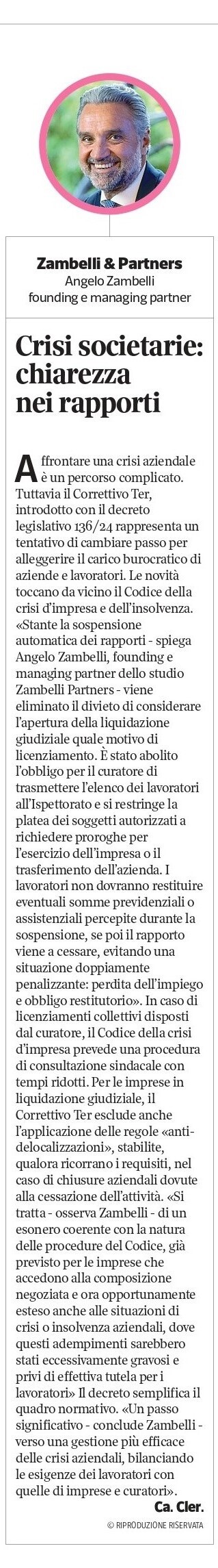 Angelo Zambelli, intervistato da Carlotta Clerici, approfondisce il tema dei rapporti di lavoro subordinato nelle crisi societarie, alla luce del decreto legislativo 136/24, il Correttivo Ter al Codice della crisi d’impresa e dell’insolvenza.