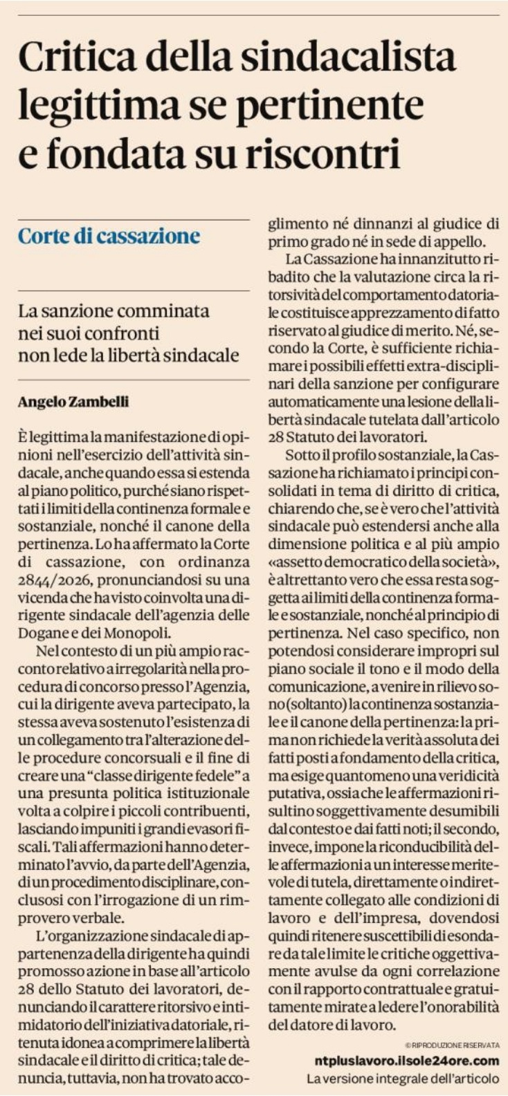 È legittima la manifestazione di opinioni nell’esercizio dell’attività sindacale, anche quando essa si estenda al piano politico, purché siano rispettati i limiti della continenza formale e sostanziale, nonché il canone della pertinenza. Lo ha affermato la Corte di cassazione, con ordinanza 2844/2026, pronunciandosi su una vicenda che ha visto coinvolta una dirigente sindacale dell’agenzia delle Dogane e dei Monopoli, sanzionata disciplinarmente per alcune dichiarazioni rese nel corso di un’intervista rilasciata a una trasmissione televisiva di inchiesta.