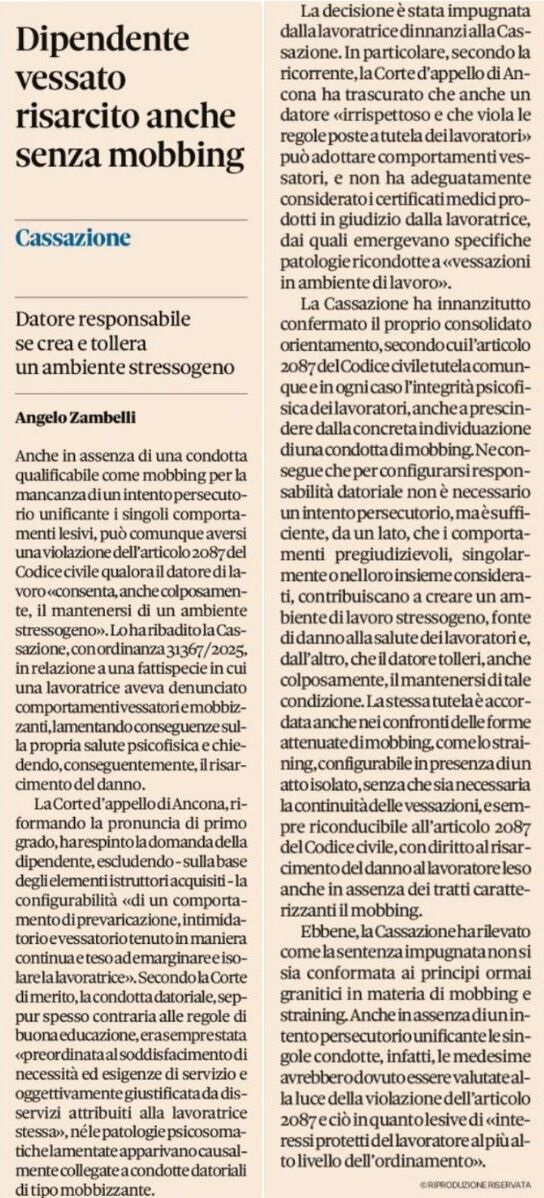 Anche in assenza di una condotta qualificabile come mobbing a causa della mancanza di un intento persecutorio unificante i singoli comportamenti lesivi, può comunque aversi una violazione dell’articolo 2087 del Codice civile qualora il datore di lavoro «consenta, anche colposamente, il mantenersi di un ambiente stressogeno». Lo ha ribadito la Corte di cassazione, con ordinanza 31367/2025, in relazione a una fattispecie in cui una lavoratrice aveva denunciato comportamenti vessatori e mobbizzanti, lamentando conseguenze sulla propria salute psicofisica e chiedendo, conseguentemente, il risarcimento del danno.