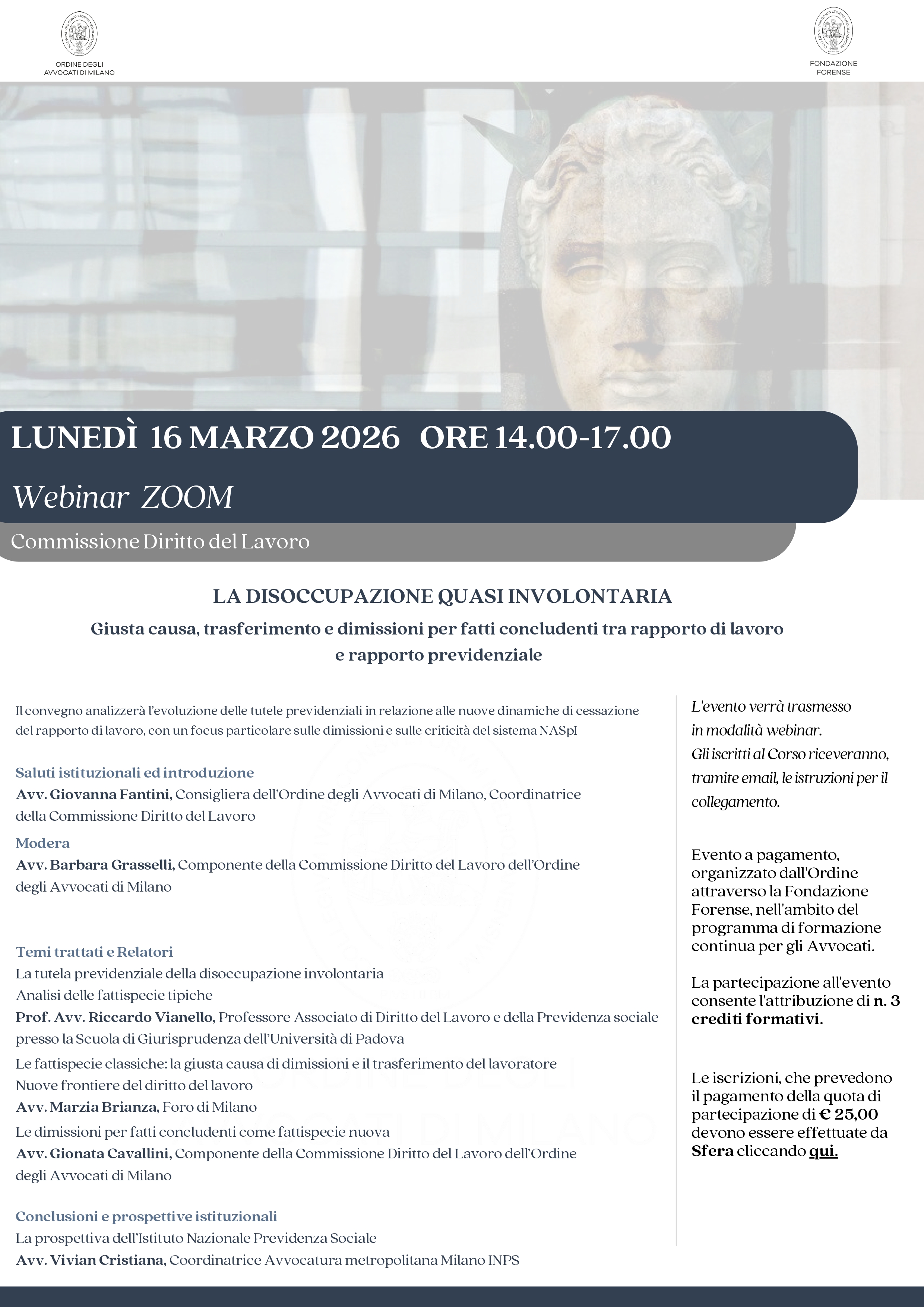 I Relatori sono: il Prof. Avv. Riccardo Vianello, Professore Associato di Diritto del Lavoro e della Previdenza sociale presso la Scuola di Giurisprudenza dell’Università di Padova, l’Avv. Marzia Brianza del Foro di Milano e l’Avv. Gionata Cavallini, Componente della Commissione Diritto del Lavoro dell’Ordine degli Avvocati di Milano.