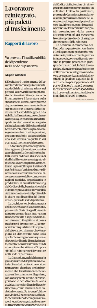 Lo ha stabilito la Corte di cassazione, con ordinanza 18892/2024 del 10 luglio scorso, in relazione a una fattispecie in cui un lavoratore, a seguito della declaratoria di illegittimità del licenziamento intimatogli e del conseguente ordine di reintegrazione, era stato trasferito dalla società datrice di lavoro presso una sede diversa da quella in cui operava al momento del recesso. La decisione, per come argomentata, aggrava indubbiamente gli oneri probatori in capo al datore di lavoro.