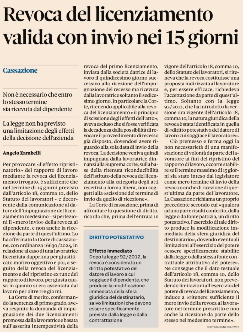 Pubblicato nelle pagine Norme & Tributi de Il Sole 24 Ore un nuovo articolo di Angelo Zambelli